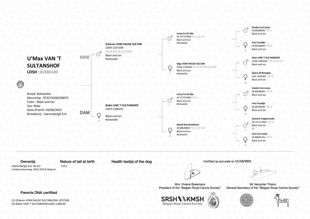 DOB: 3 June 2021Vader - Sire:Q'Baron vom Hause SultanMoeder - Dam:Robin van 't SultanshofHD:AED:0/0JLPP:N/NEyes: clear